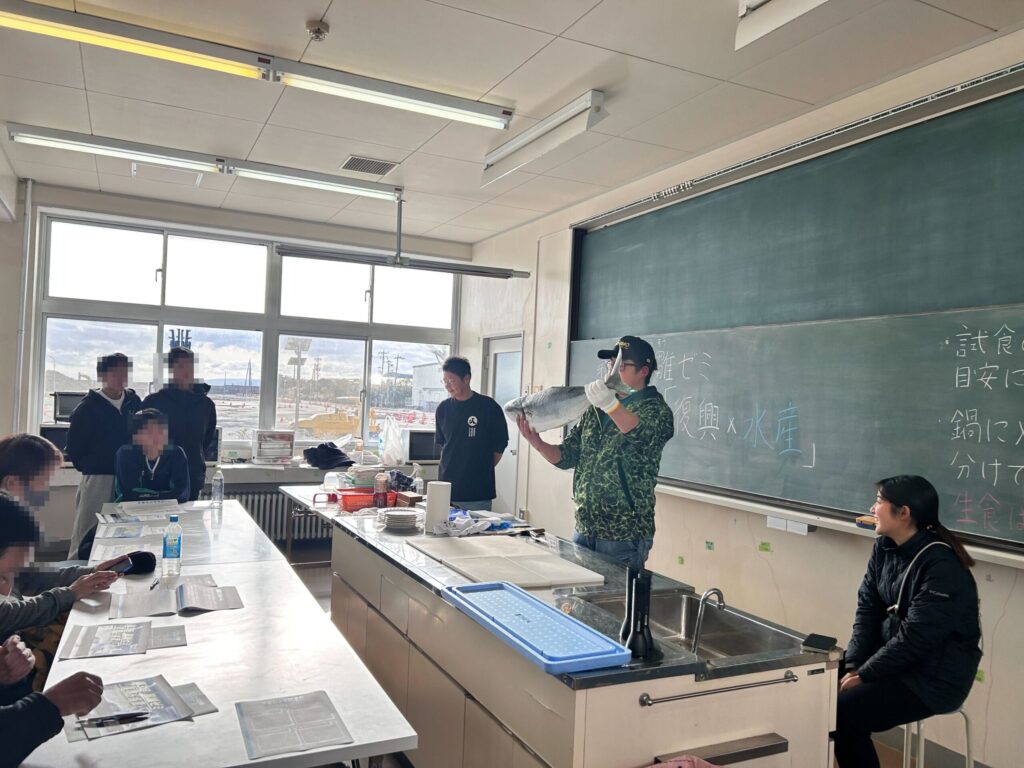 導入のブリしゃぶ試食会の様子。日の出大敷で働いている能登高校OBの方が捌いてくださいました。