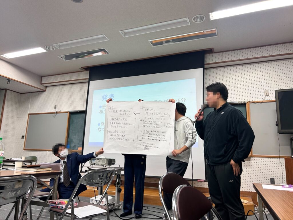 その後、視聴覚室に移動して水産業の基本知識を学び、中田さんの取り組みについてお話を伺いました。そして、それを踏まえて全体でディスカッションを行いました。テーマは、「能登の魚の魅力をより多くの人に知って、そして買ってもらうには具体的にどのような取り組みをすれば良いでしょうか?」です。参加の方同士で熱い議論が交わされ、5W1Hも意識した具体的な取り組み案が挙がってきました。また、発表の段階でも積極的に高校生が発表する様子が見られました。